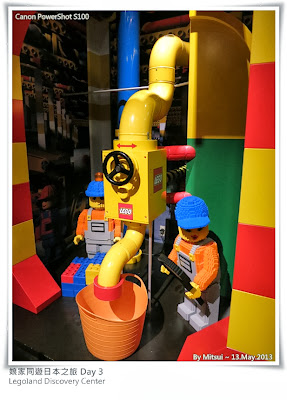 在お台場アクセスマップ的三樓領取入場票後,便乘搭專用的升降機到七樓,正式開始參觀。七樓的入口附近,有數個大型Lego機械玩意,可以讓參觀者玩玩。我們當然又玩下下,不過有些機械不動操件,守在這裡的職員看到我們的迷茫,便上前來指導,她更主動為我們拍合照呢。